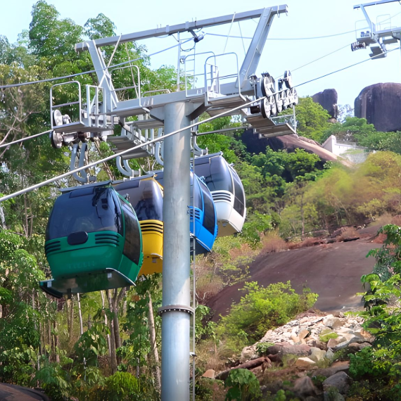 Revolving Group Gondola Ropeway at the Jatayu Earth’s Center nature park. The ropeway is one of the attractions of the park and it transports the visitors up to the impressive sculpture on the top.