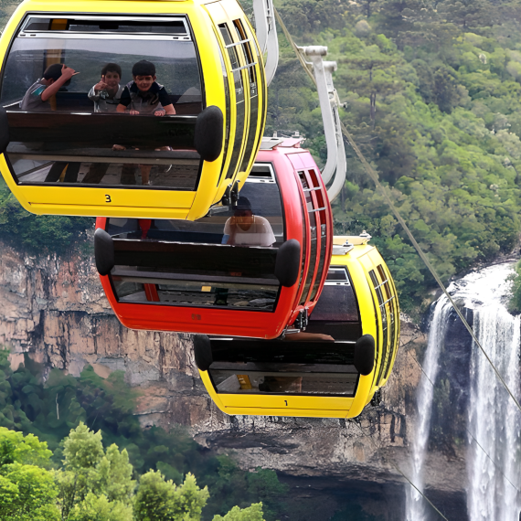 Revolving Group Gondola in Rio Grande do Sul, overlooking the spectacular and scenic Caracol Waterfall nearby. It has three beautiful stations in the midst of lush nature between mountains and valleys.